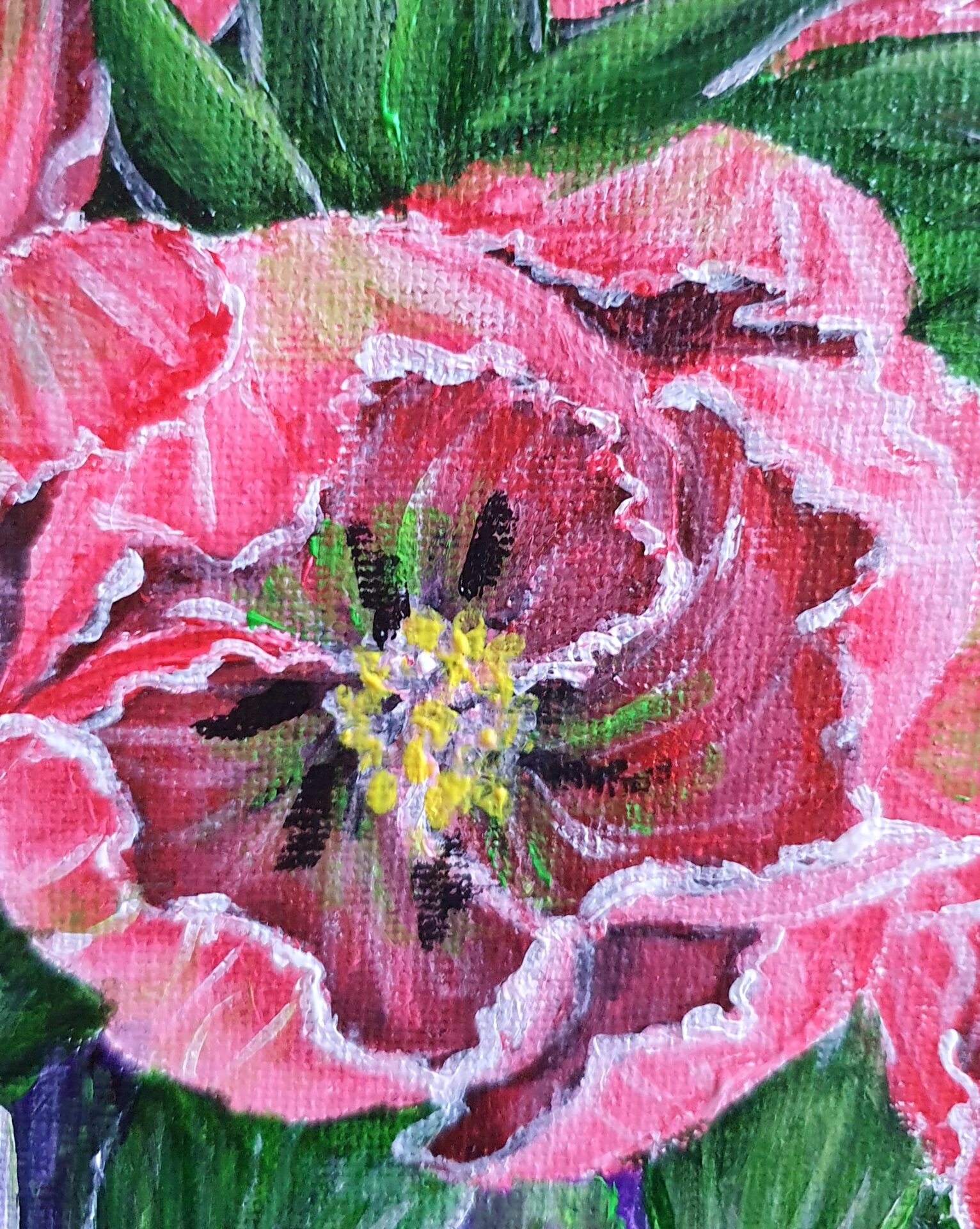 When I painted this bouquet of delicate pink tulips, I aimed to capture their softness and natural grace. Tulips, for me, symbolize renewal and love—each bloom unfurling as if to offer hope and warmth. The soft pink petals with intricate white edges add a sense of elegance and charm, while the lush green leaves bring a vibrant contrast, embodying the balance of beauty in nature.