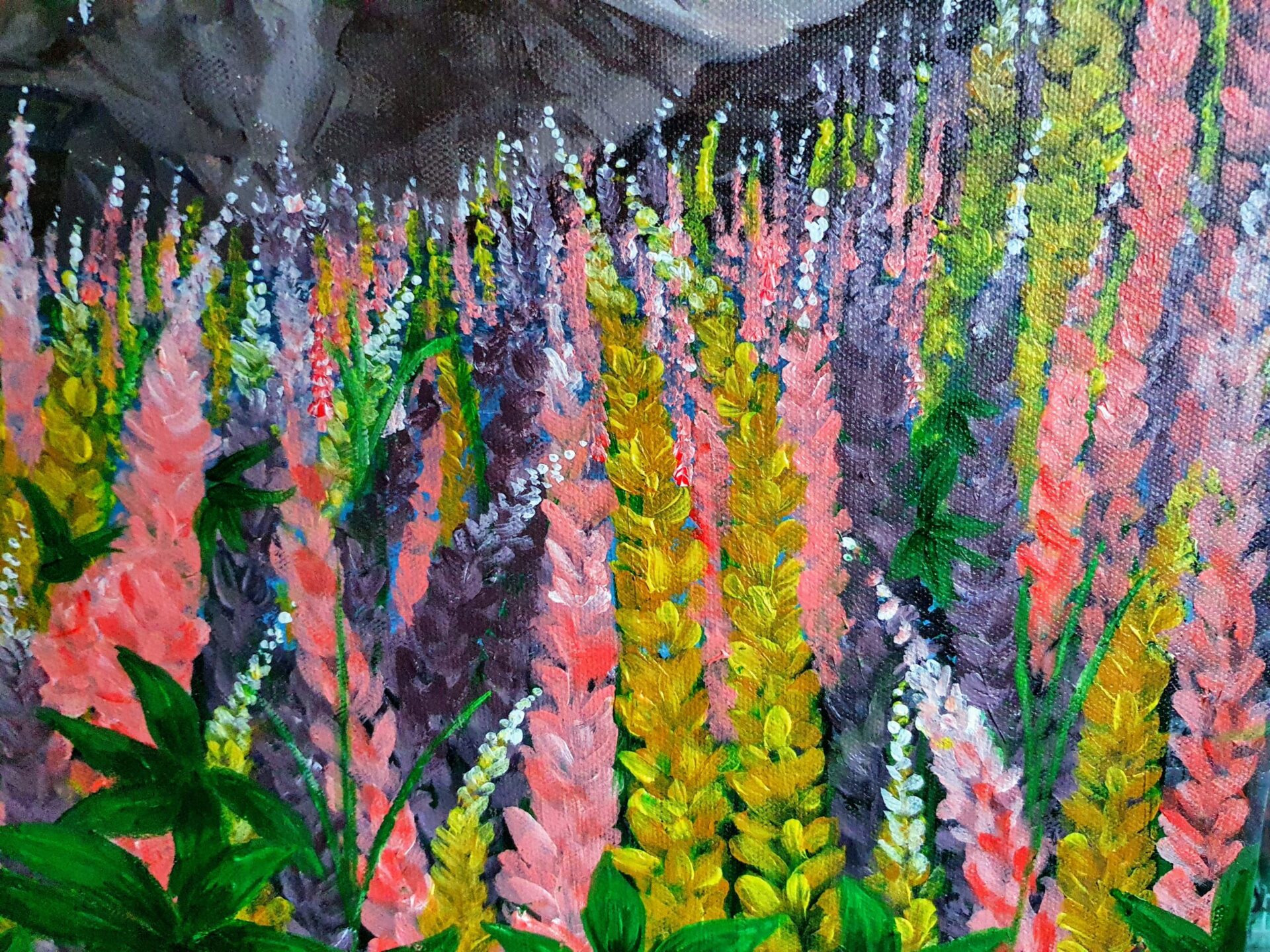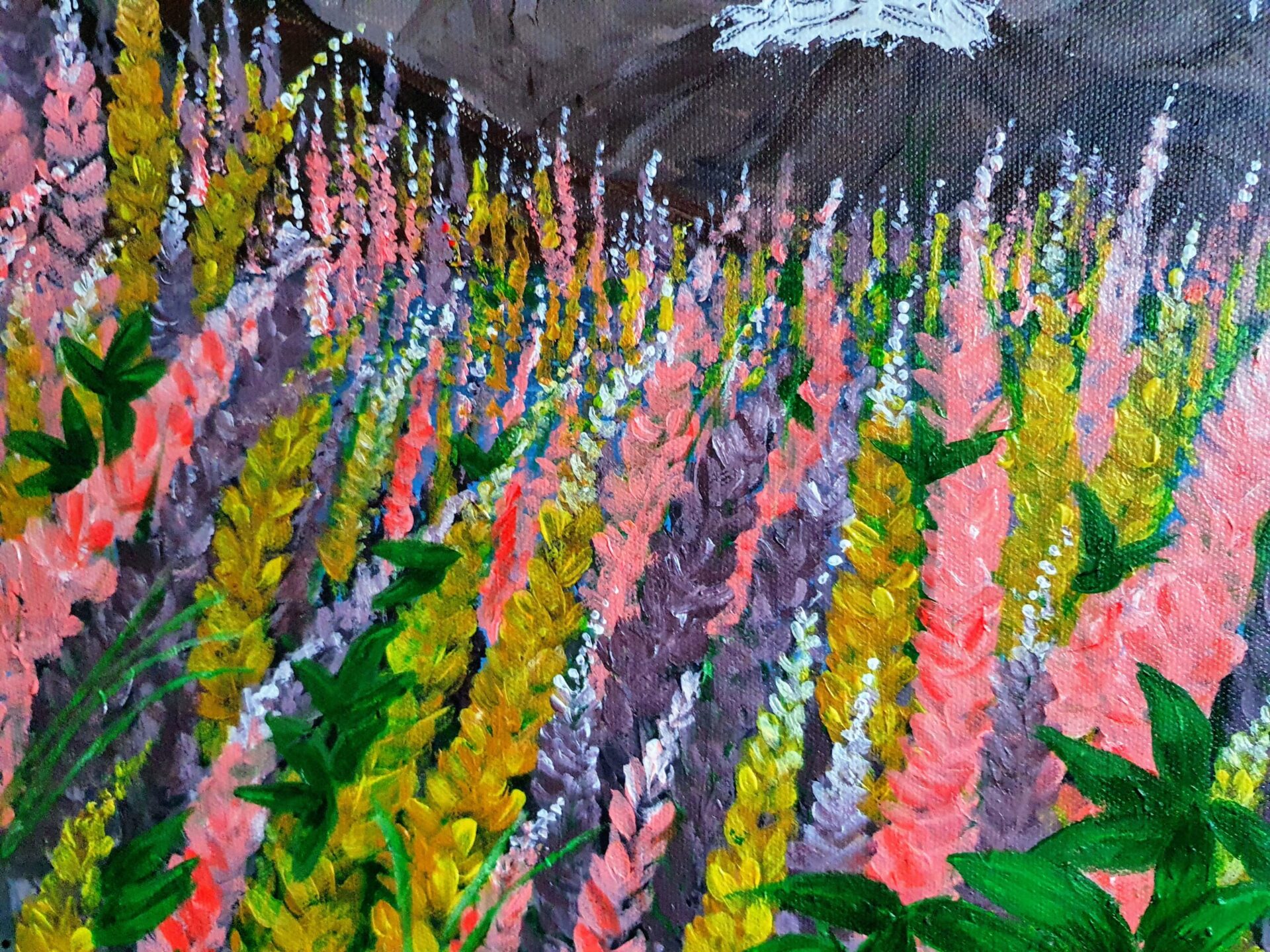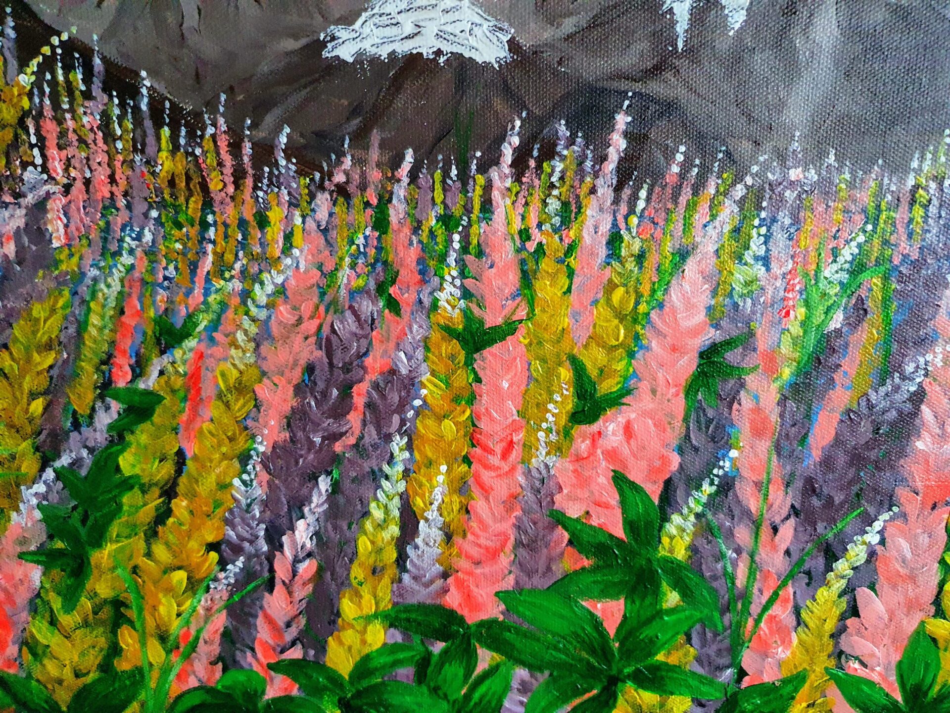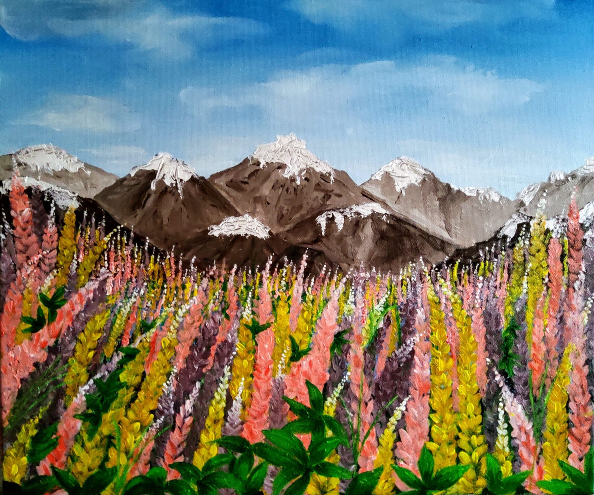 When I painted this scenic landscape of wildflowers against the backdrop of majestic snow-capped mountains, I wanted to convey the beauty and harmony of nature in its purest form. The vibrant pink, yellow, and lavender flowers stretch across the foreground, leading the eye toward the rugged mountains and the clear blue sky above. It’s a celebration of the contrast between the delicate blooms and the strength of the towering peaks.